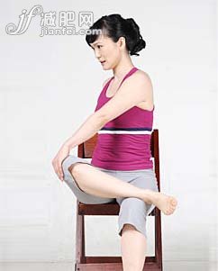Step1 坐在椅子上,右腿屈膝放在左大腿上,右手放在椅子后,左手放在右腿膝蓋上。