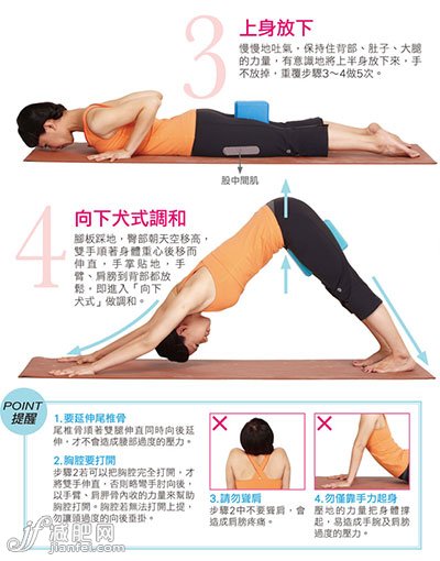 4,向下犬式調(diào)和,腳踩地板,臀部朝向天空移高,雙手順著身體重心后移而伸直,手掌貼地,手臂肩膀到背部都放松,即進(jìn)入向下犬式做調(diào)和。