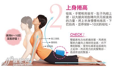2、上身卷高:吸氣,手臂輕甲夾后背,以大腿夾瑜伽磚的力量,將上半身慢慢卷高,下巴抬高,并停留8——10秒。注意:雙腿有力的把磚夾緊,再將夾緊的力量傳到骨盆底,下傳到腳底板,使脊柱順著這弧線向上延伸,而非有力的夾緊臀部,造成骨盆的緊張。
