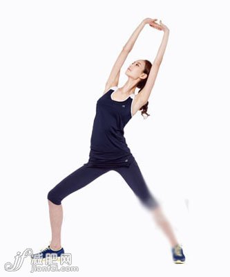 1. 兩腿最大限度地打開,右腿呈90度彎曲之后雙手交叉抬起兩臂。