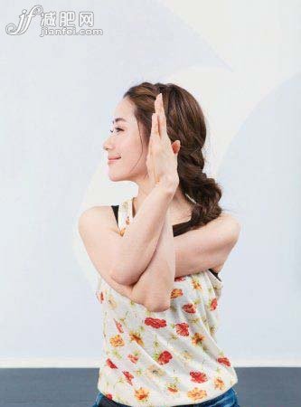 抬手臂與胸平,右手肘下左手肘上,雙手纏繞雙掌相合,大拇指指向鼻尖。肩膀向下沉,不要聳肩,保持脊背向上的延展。3-5個呼吸。保持手臂相互對抗,感覺后側肩胛骨向外打開。