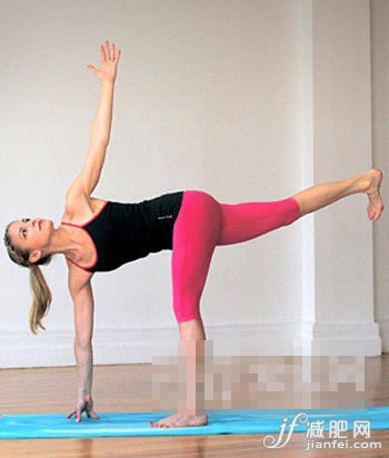 左腳與右手同時(shí)摸地,再同時(shí)抬起右腳與左手,左手往天花板延伸,眼睛盯著左手看,停留5個(gè)深呼吸后再換邊。
