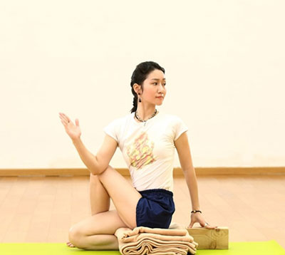 這是一個更為高級的扭轉(zhuǎn)體式。我們需要讓一腿折疊在下方,讓腳掌豎著立在地面上,上面的腳跨過來放在膝蓋的外側(cè),腳尖和膝蓋在一條線上,上面腿應(yīng)該是垂直的??梢园淹尾肯旅鎵|上一個毯子,以防骨盆不會向后部倒,使背能向上立起來,隨著呼氣的時候轉(zhuǎn),同樣吸氣拉伸脊柱,呼氣把中背部推入體內(nèi),增加扭轉(zhuǎn)。