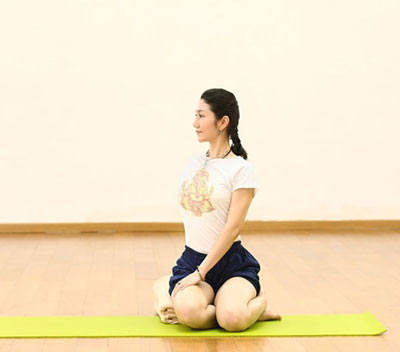 坐在毛毯上。把毛毯墊高,以使骨盆兩側(cè)都是等高而不是傾斜的。雙腿膝蓋靠近,然后上面折疊的腿,腳踝要放在腳心上,所有的腳趾都是鋪在地上的。兩只手要均勻地推,隨著呼氣去扭轉(zhuǎn)身體,來扭轉(zhuǎn)腰腹,增加脊椎的活力和供血。這是一個坐姿的練習(xí)。