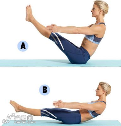 坐在墊子上,上半身往后靠,手臂平行延伸,兩腿抬離地面,呈船狀(見(jiàn)圖A)。就這樣保持3個(gè)呼吸后,背部往后微微降低,同時(shí)兩腿向前伸直,不要觸到地板,呈半船狀(見(jiàn)圖B),保持3次呼吸,然后回復(fù)到起始狀態(tài),重復(fù)10次。