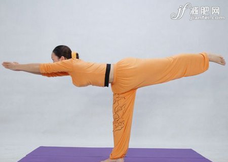 從武士II姿勢開始,把手放在臀部上,上身直著向前傾,抬起左腳,尋找平衡,然后上身完全向前,提起左腿直到身體和左腿平行。充分伸展左腿,從 臀部到腳趾。保持臀部正直,臉朝向地板。雙臂在身體兩側(cè)伸直,手心朝里面。保持5次呼吸的時間。如果這個動作對你來說難度太大,你在最初的時候可以把腿架 在一把椅子上。