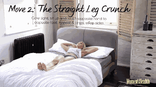第二步:類似仰臥起坐的動作,雙手放置腦后,起身后用手去觸碰腳尖,然后換邊進行,重復五次。