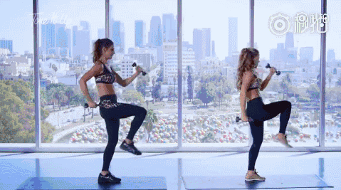 STEP3:真正要命的減脂運動開始了,此時你需要兩個啞鈴。左腳單腳站立,上半身做前后擺臂的動作,右腿先屈膝,然后向后伸展,注意保持身體的平衡。這個動作重復20次。