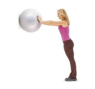 1. 面壁而立,距離墻壁一米左右,雙手按住一只健身球,向墻上擠壓,保持雙手與肩膀同高。