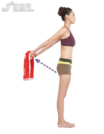 STEP 2 雙手后抬:腹部吐氣,雙手同時往后往上伸抬到最高,保持呼吸維持20秒。身體要稍微往前傾,有助肩背適當出力。