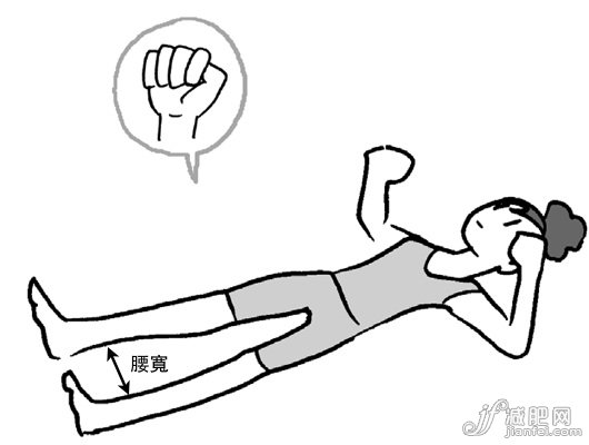 1丶先在床上躺平,雙腳打開與腰同寬。雙手伸平與肩同高後,手肘呈90 度向上彎起,拇指內(nèi)扣握拳。