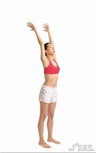 手掌相對(duì),雙手慢慢往上舉直,十指張開,膝蓋不要彎曲,腳跟勿抬起。