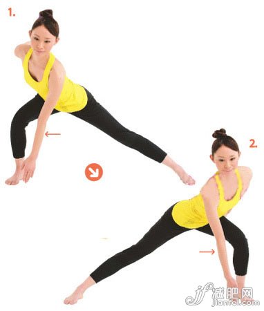 1、雙腿并攏站直后,右腿向右側(cè)跨出一步,并切向前偏右的方向屈膝,令大腿與小腿的夾角接近90度,重心移到右腳上,臀部下沉,上身繃直向前傾出,但仰起頭部和胸廓,微微向右轉(zhuǎn)向,同時(shí)將右手叉腰,左臂伸直,用手指觸碰腳趾內(nèi)側(cè)的地面。