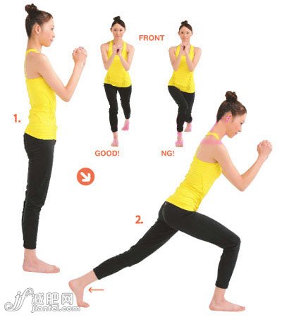 2、左腿向后跨出一大步,腳跟離地用腳趾撐開,右腿屈膝,大小腿成90度,同時(shí)上身挺直前傾保持雙臂的姿勢(shì)。注意右腿不要向內(nèi)側(cè)屈膝。