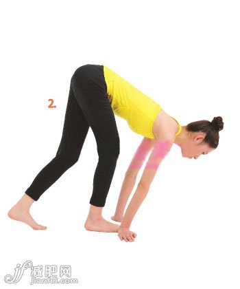 2、雙腿慢慢打開角度,膝蓋舒展開,保持微微的彎曲狀態(tài),抬起臀部,上身進(jìn)一步俯下,雙臂保持伸直,手掌完全著地,但左腳跟始終離地。