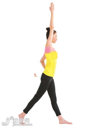 1、左手叉腰,右臂伸直往正上方舉高,手掌繃直,指尖指向上方。右腿向后邁出一步,用腳趾著地,雙腿繃直,重心落在雙腳之間。