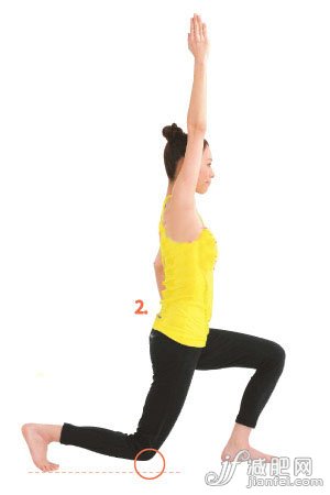 2、然后臀部下沉,雙膝彎曲,右膝跪地,左側(cè)大腿與地面平衡,保持上身挺直,右臂舉高,左右叉腰的姿勢(shì)。