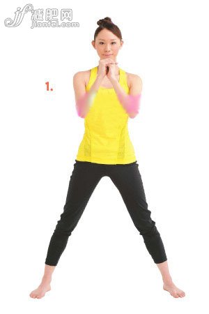 1、雙臂屈肘,雙手相握,舉于與肩同高的位置,雙腳分別向兩側邁步站立,膝蓋繃直,上身收腹挺直,重心落于兩腳之間。