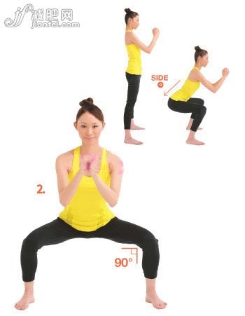 2、保持握拳的姿勢,臀部下沉,雙膝向前彎曲,令左右大腿互相處于同一個平面上,同時分別與小腿成90度,上身挺直往前傾出,臀部向后拉下。