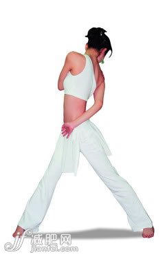 雙腿開立約兩步寬,吸氣時雙臂從體側(cè)抬起與肩平行。呼氣時身體帶雙臂自然向左后方扭轉(zhuǎn),左臂曲肘放在右后腰旁,右手曲肘放在左肩上。到最大限度保持3~5個呼吸,感覺到整個背部和脊柱的扭轉(zhuǎn)。然后換方向做相同的動作。