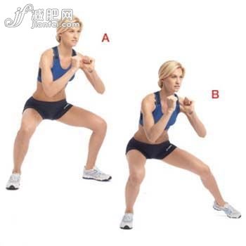 雙腿向外打開45度,兩腳距離寬于髖部,然后身體蹲下,如圖(A)。從那個姿勢開始,左腳向外跨出,保持蹲坐的姿勢,如圖(B)。向右跨一步,恢復(fù)開始位置。繼續(xù)橫著跨步,先向右跨10步,再向左跨10步。