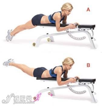 俯臥在一張長(zhǎng)凳上,雙腿吊在長(zhǎng)凳邊緣之外,如圖(A)。腹部用力,抬起雙腿知道身體成一直線,如圖(B)。保持5秒鐘,然后慢慢地放下腿。做10-15次。