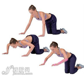 2、手肘分別向左右兩 側(cè)彎曲,上身壓下,跪地做俯臥撐的動作。