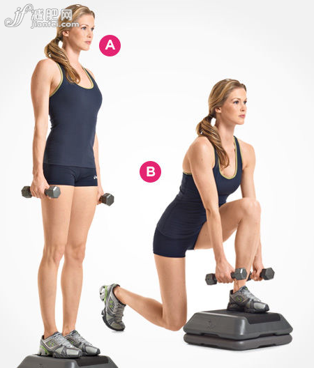 站在一個15厘米高的盒子上,兩手分別握住一只較輕的啞鈴(1至2公斤)垂在身體兩側(cè)(見圖A)。右腿后退一步呈馬步,膝蓋無限接近地面,同時臀部帶動身體往前傾(見圖B)。右腳回到盒子上,換左腳做相同的動作,每條腿10次,重復(fù)3組。