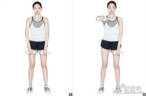 ?。?)稍微彎曲膝蓋,身體往前傾,兩手舉起塑料瓶,手肘固定在身側(cè)。