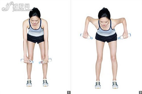 ?。?)兩手舉起塑料瓶,手肘稍微彎曲,身體前傾。這時(shí)背部要挺直。