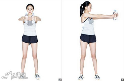 ?。?)雙腿張開(kāi)到等肩寬,兩手把塑料瓶舉到胸前。
