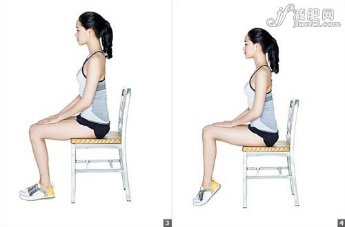?。?)坐在椅子上,但不要壓上所有重量,兩手放在膝蓋上,膝蓋維持直角。