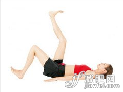 3.屈膝,仰面躺著。抬起左腳腳尖,右腳直往上抬。想象一下右腳上放有一個(gè)盆子,打平腳板。