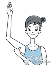 左手手掌放在右手手臂上,順著腋窩淋巴結(jié)的方向進(jìn)行按揉,同時(shí)右手慢慢向上抬高。一只手做3~5次,換一只手動(dòng)作不變。
