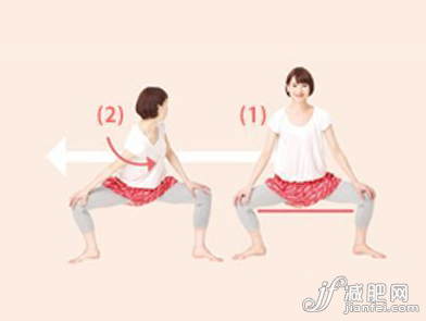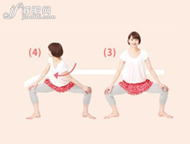 1. 大幅度張開雙腿,腳尖略微向外側擺出準備姿勢。降低腰部是大腿與地面平行。甚至背肌,不要弓起。