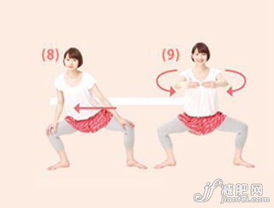 9. 回到準(zhǔn)備姿勢(shì)后,保持腰部高度不變,雙手在胸前抱圓。慢慢調(diào)整呼吸。