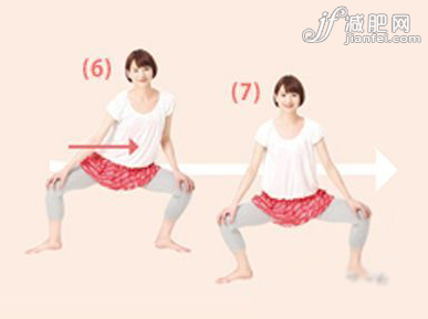 6. 腰部保持準(zhǔn)備姿勢(shì)時(shí)的高度,向左側(cè)平移。髖關(guān)節(jié)周圍感覺見效即可,