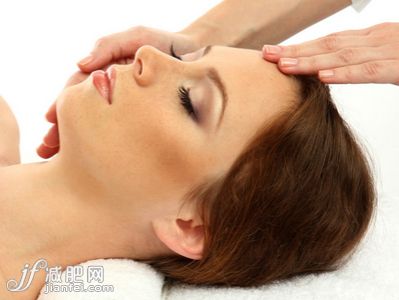 2.兩手除了拇指以外的4根手指貼著下顎。沿著臉部的頜骨線條,一直搓揉至太陽穴的位置。然后是從鼻翼到太陽穴,額頭到太陽穴,按照這樣的順序輕輕地進行搓按。