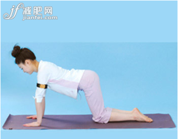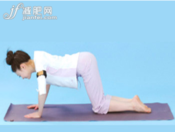 2、翹起臀部,俯下上半身,但不要接觸地面。用手臂撐住身體,像做俯臥撐的姿勢,拉伸胸部肌肉。