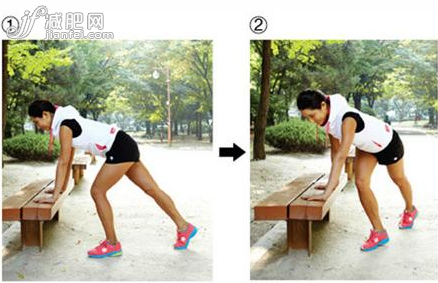 Tip:雙手按住凳子時(shí),如果偏向于肩膀左邊的話,手腕和肩膀都會(huì)覺(jué)得不適,所以手臂要在肩膀之下成一直線。只要姿勢(shì)正確,這個(gè)跳躍動(dòng)作對(duì)于塑造性感美腿相當(dāng)有效哦。