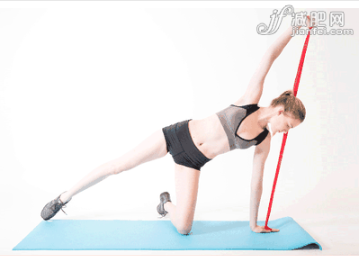 跪在瑜伽墊上,伸直右腿。雙手拽住彈力帶并伸展開(kāi),右手貼在地上,開(kāi)始抬腿。重復(fù)此動(dòng)作兩分鐘這個(gè)動(dòng)作可以幫助你鍛煉大腿線條和腿部的核心力量。