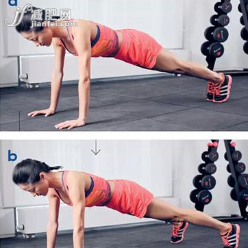 2、收縮腹部,將一側(cè)膝蓋提至胸前,感受腹部被擠壓,另一側(cè)腿蹬地維持穩(wěn)定。臀部至大腿后側(cè)產(chǎn)生明顯拉伸感后收腿,回到俯臥撐位。