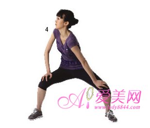 4、兩腿分開約兩個肩寬,膝蓋彎曲,呈半蹲姿勢,兩手放在膝蓋處,然后上半身向左右兩側(cè)扭轉(zhuǎn)。
