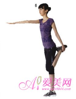 6、站姿,向后彎曲左膝蓋,左手抓住腳背,右手向前伸直,掌心向下,拉伸腿部及腰臀。