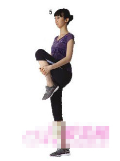 5、站姿,彎曲左膝蓋,兩手抱住左小腿,拉向身體。然后換右腿重復(fù)。
