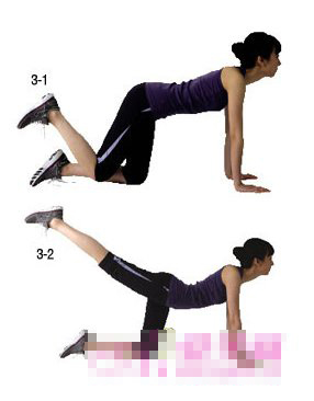 3-1、俯身跪在地上,兩臂伸直撐住上身,右腿屈膝稍稍抬離地面。