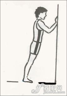 面檣壁站立,右腳前左腳后,右腳跟應放在左腳腳趾前30~45公分處。雙手手掌平貼檣壁。右膝彎曲,左腳幾乎打直。臀部緩緩向前推,直到小腿或左腿有拉緊的感覺為止。保持此姿勢15~30秒。之后略彎起左腳著膝,但左腳跟不離地,拉緊左腳的腱。另一腳重復此動作。