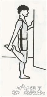 面向檣壁站立,右手頂住檣,撐起身體。右腿舉向臀部,再用右手握住腳背或胎踝。輕拉起右腳靠向臀部,使得大腿有拉緊的感覺。保持此姿勢10~20秒。之後另一只腳重復該動作。