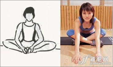坐在地面雙腳的腳底并攏。為穩(wěn)住此姿勢用雙手握住雙腳,再將腳跟拉向鼠蹊部(左圖)。上臀或手肘壓在各膝蓋的內(nèi)側(cè),身體向前傾,讓膝蓋壓向地面(右圖)。鼠蹊部與背部下方應有拉緊的感覺。保持此姿勢15~30秒不動。