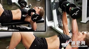俯臥,彎曲膝蓋,雙腳放在地板或板凳上,脊柱放松;雙手握住啞鈴,向天花板舉起啞鈴,再慢慢放下,見左圖;然后,再做擴(kuò)胸動作,肘部不彎曲,手臂向兩邊緩慢移動,身體貼緊板凳,不搖晃。